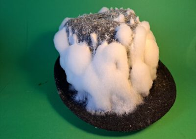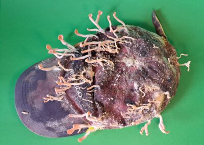 Mushrooms at the End of the World is centred on fungi – organisms that connect all life on earth. Among the planet’s oldest inhabitants, fungi are found everywhere around us and even inside us. They possess incredible transformative power, turning rocks into soil, producing poisons and hallucinations, cleaning radioactive soil, and degrading crude oil and plastic. They are also vital for forests and trees, with which they exchange essential substances for survival. The artwork visualizes the transformation of ordinary human objects, houses, and cities, from which fungi create the fertile soil for a new beginning.