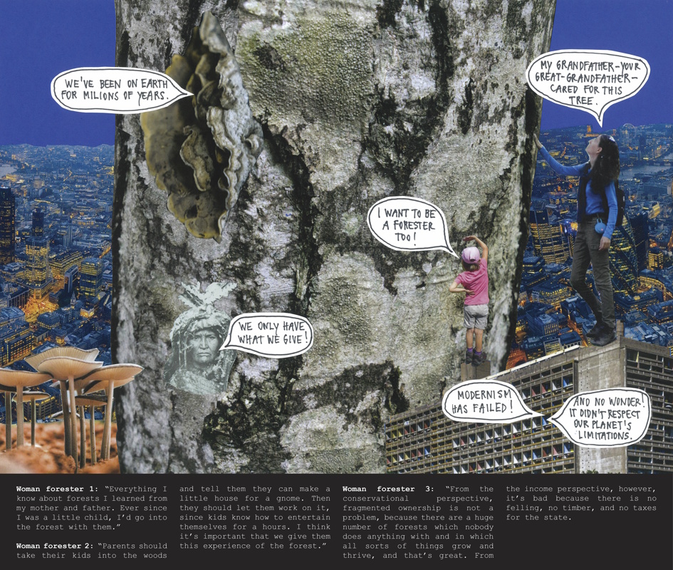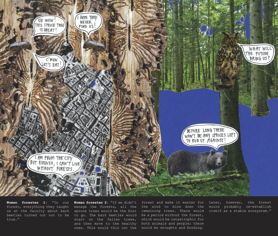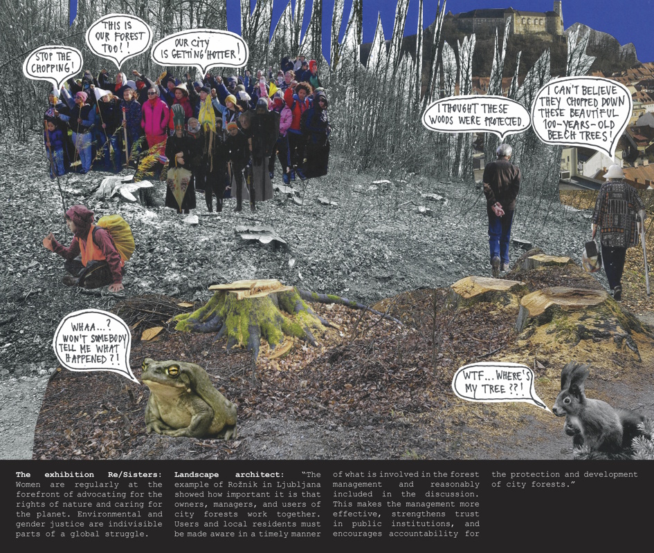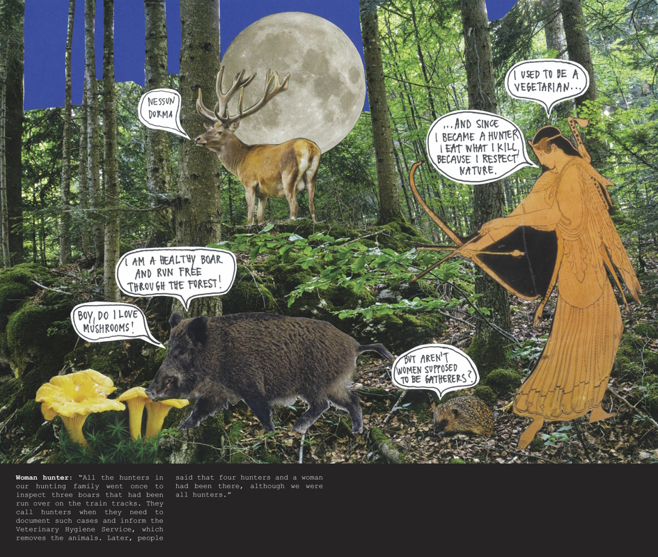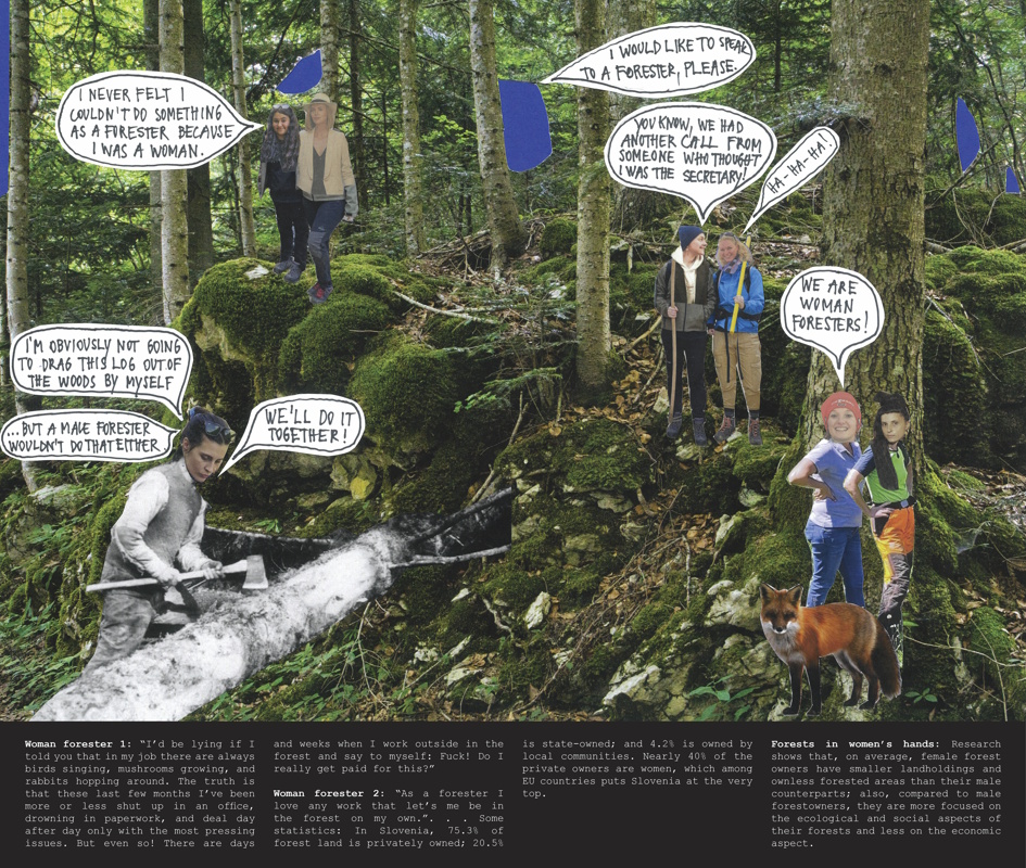 Spotlighting women foresters, hunters, and forest owners in Slovenia, The Forest in Women’s Hands series of collages and the What Women Foresters Told Me zine examine our relationship to forests through the question of gender. In doing so, both rely on research by the Slovenian Forestry Institute, Fem4Forest: Forests in Women’s Hands (2020–22), which shows that, in contrast to their male counterparts, female forest owners are more likely to prioritize the ecological and social functions of their forest land over commercial interests. Both works are based on interviews with women foresters, hunters, and forest owners in Slovenia: Katarina Flajšman, Marija Jakopin, Janja Lukanc, Lucija Odar, and Veronika Valentar.